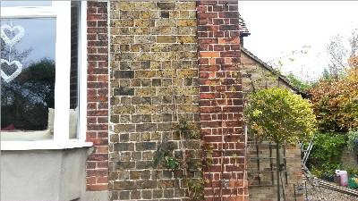 Old buildings accumulate a lot of surface dirt over many years. General staining is caused by a gradual build up of carbon deposits in the air. Other stains can be caused by random paint splashes, cement stains or dripping pipes and damp walls which cause a build up of moss etc on the brick surface.