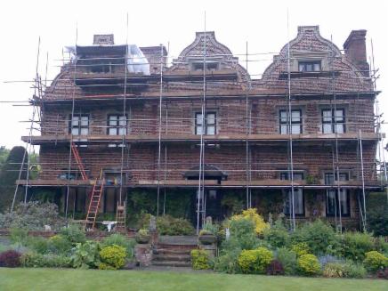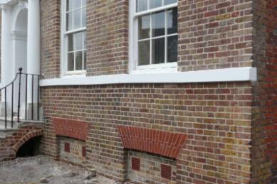 Below: Listed Stanstead Hall, Stanstead Abbotts. Main brickwork repointed with a flush finish. Arches were Tuck Pointed.
