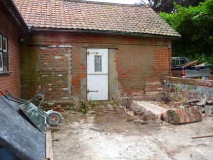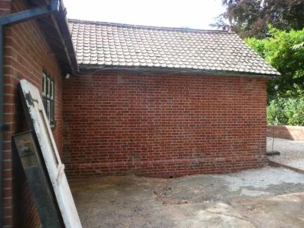 Below: Side of old garage at Red House Farm, Aldham, Ipswich: Brickwork repaired and repointed with a flush lime mortar joint