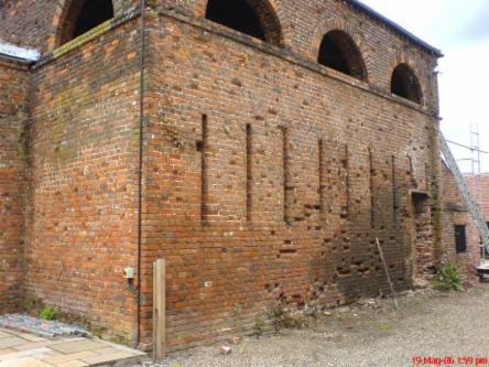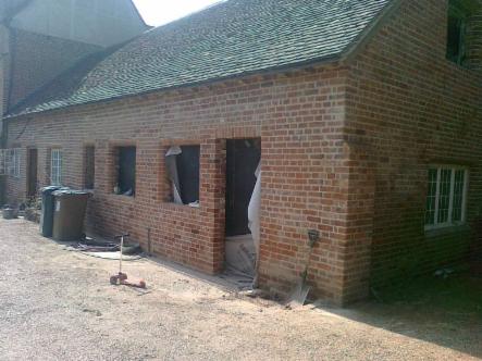 Below: Old garages at Furneaux Pelham Hall. Door openings infilled with reclaimed bricks and repointed using lime mortar to match existing brickwork.